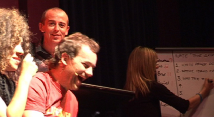 Akmal Saleh, Greg Fleet, Bob Franklin and Claire Hooper serve it up to Justin Morley.